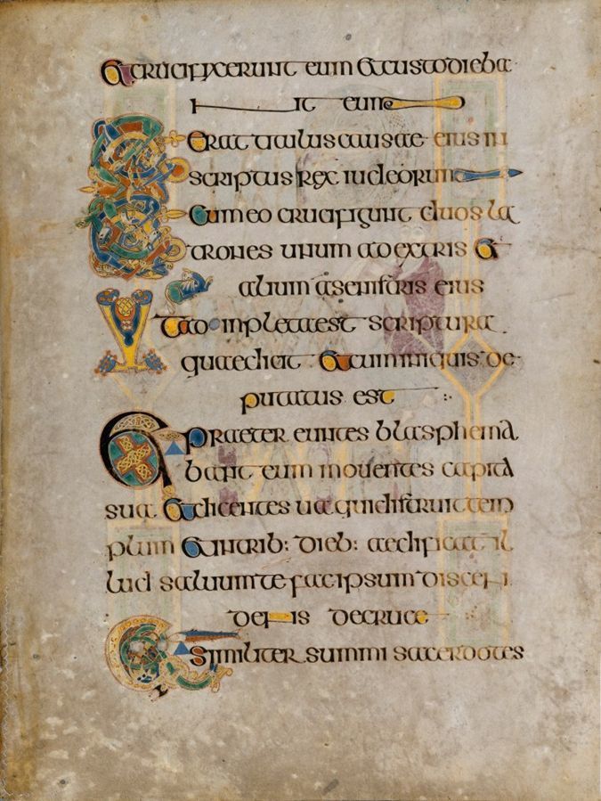 翌8月9日は朝一で1592年創立、アイルランド最古のトリニティ・カレッジへ『ケルズの書』を見に行きました。ダブリン訪問の目的2つ目がこれです。『ケルズの書』とは8~9世紀に修道士によって書かれた美しい4つの福音書の装飾写本です。すなわち、マルコ、ルカ、ヨハネ、マタイの福音書です。ヴァイキングの襲撃から逃れ、未完の書をたずさえて、アイルランド島にたどり着いた修道士たちが、ダブリン北西のケルズの修道院にて完成したので『ケルズの書』と呼ばれています。150頭分もの仔牛の革を用い、全部で340枚あるそうです。展示室のガラスケースの中に1冊は丸ごと絵のページ、もう1冊は文章のページが開かれていました。鮮明で色も美しく、これが1200年以上も前の本とは驚きました。撮影不可でしたので、画像はトリニティ・カレッジのホームーページより拝借しました。実際に展示されていたものは、もっと白くて彩色も鮮やかでした。