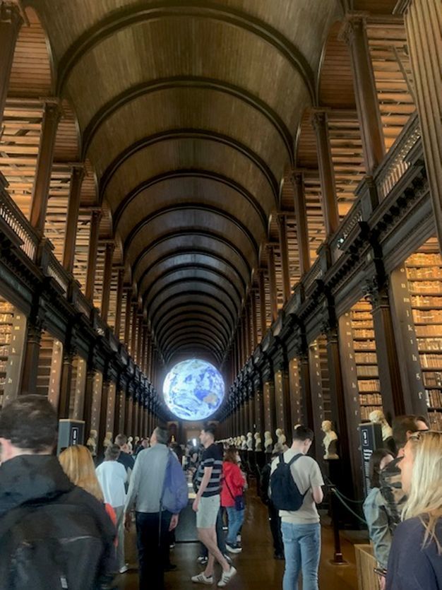 保管されていたのはトリニティ・カレッジのオールド・ライブラリーです。長さ65メートルもある「ロング・ルーム」と呼ばれる、世界で最も美しい図書館のひとつです。中央通路にはジョナサン・スウィフト、オスカー・ワイルドやイェイツの胸像が並び、アイルランド国章のモデルになっている最古のアイリッシュハープも展示されていました。残念ながら肝心の蔵書は2024年より埃等から守るため、別の建物に移され本棚はほぼ空っぽでした。