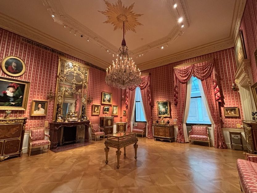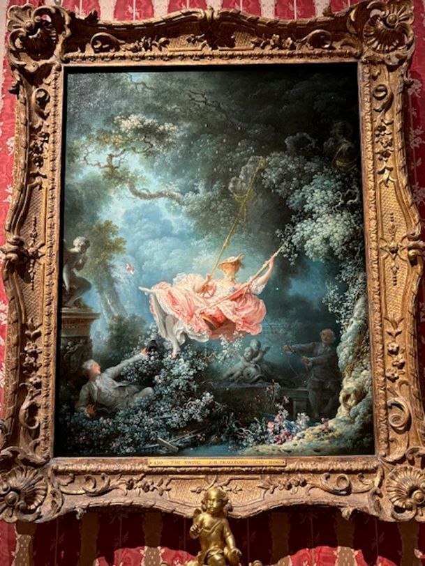 4代目侯爵とリチャード・ウォレスがフランスで育ったため、フランスの宮廷画家ブーシェ、フラゴナールの絵画や、ブルボン王家、ナポレオン一家に由来する品々なども多く展示されています。フランス絵画の部屋も家具・調度品がその時代つまりロココ様式に合わせて調えられ、窓と窓の間の壁にはフラゴナールの「ブランコ」が掛かっていました。