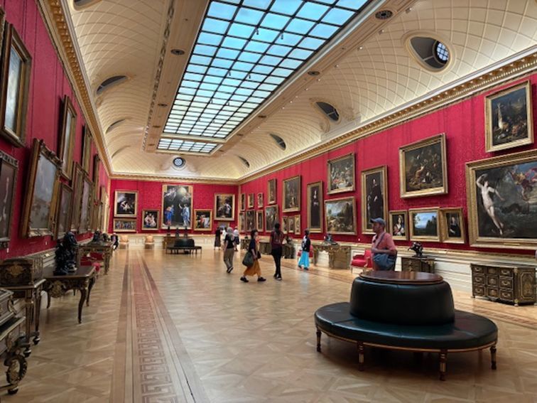 第96回の続きです。8月13日は「ウォレス・コレクション」に行きました。ウォレス・コレクションとは、ロンドン中心部にあり、18・19世紀に4代に亙るハートフォード侯爵家とその子息リチャード・ウォレス卿が集めた芸術品を、未亡人が1897年に国に寄贈したことから始まりました。なぜハートフォード・コレクションと言わないのかは、4代目リチャード侯爵は生涯独身で、認知していない庶子リチャード(父と同名)が母方の姓ウォレスを名乗ったからです。ウォレス卿一家が生前暮らした、ハートフォード・ハウスに改修を加え、1900年に美術館として開館。18世紀後期のインテリアが保存されたまま、膨大なコレクションが展示されています。25室のギャラリーには、絵画・彫刻・家具・武器と鎧・磁器の比類のない傑作を収蔵しており国立美術館となっています。画像の大きな部屋はスペイン絵画と家具・調度品の部屋になっていました。